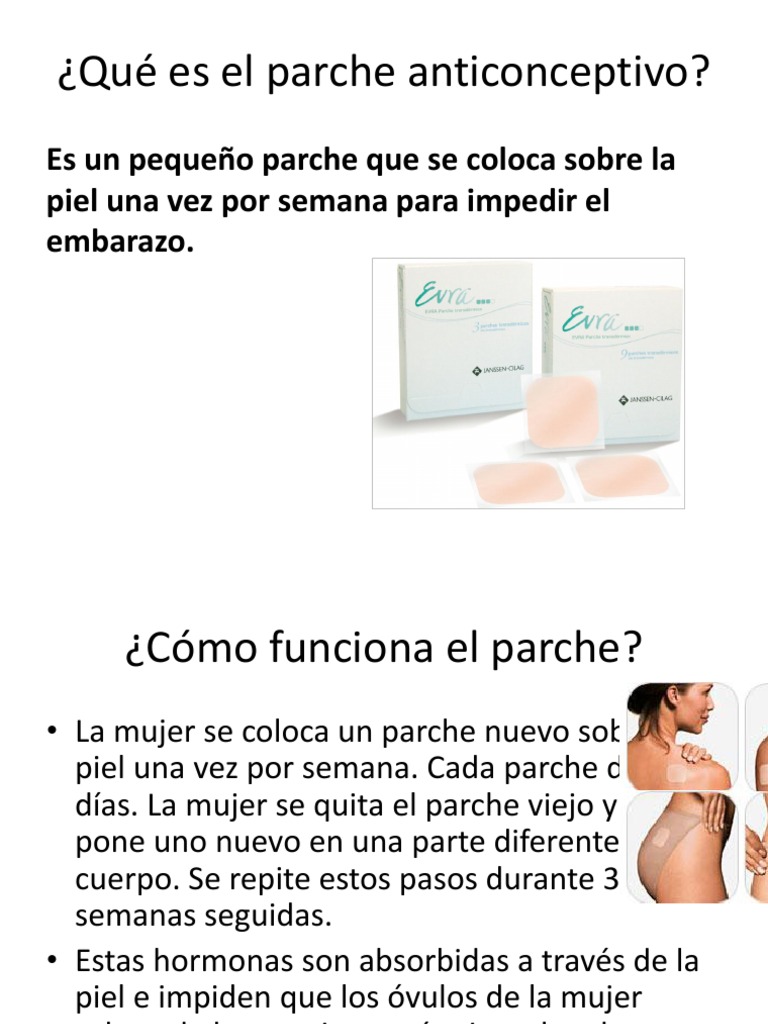 Puedes esperar que tu período menstrual se presente pocos días después de que te quites el tercer parche anticonceptivo durante la cuarta semana la semana sin parche. El parche transdérmico es un método anticonceptivo hormonal femenino relativamente nuevo para la mujer. S on una especie de curita cuadrada de 45 cm. Qué es el parche transdérmico anticonceptivo. Este parche cutáneo indoloro y muy sencillo de colocar cuenta con una eficacia del 997 si se utiliza de manera correcta. El parche anticonceptivo nombre comercial Ortho Evra es un cuadrado delgado de color beige de 445 centímetros 1 ¾ pulgadas que se adhiere a tu piel como una venda adhesiva. De lado y menos de 1 mm de grosor que se coloca sobre la piel una vez a la semana. El parche anticonceptivo hormonal se emplea para prevenir el embarazo de la misma forma que la píldora al inhibir la producción de óvulos en los ovarios. El parche anticonceptivo es un parche plástico beige y fino que se adhiere a la piel y evita que las mujeres salgan embarazadas.