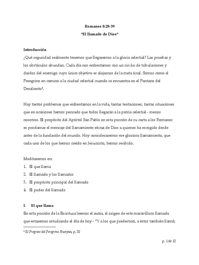 Romanos 828-39 28 Y sabemos que para los que aman a Dios todas las cosas cooperan para bien esto es para los que son llamados conforme a su propósito. Romanos 835 - 93 Continuamos estudiando hoy el capítulo 8 de esta epístola del apóstol Pablo a los Romanos. El capítulo 8 es una conclusión gloriosa a las doctrinas magnificas del hombre perdido y la salvación recta de Dios las cuales Pablo sistematicamente nos presentbaba en capítulos 1-7.