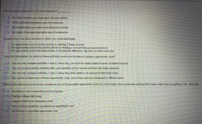 The opportunity cost of going to college is best measured by the. Choosing a major and a minor. Cost of room and board b. The opportunity cost of going to college is best measured by the a.